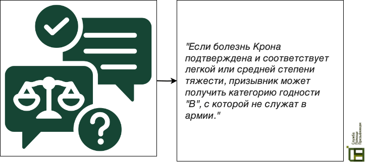 Чтобы не столкнуться с трудностями в процессе призыва, призывникам с болезнью Крона необходимо собрать медицинские документы от гастроэнтеролога — рентгенографию и колоноскопию. Чаще всего процесс получения военного билета по этому заболеванию не превышает 6 месяцев, но может быть увеличен из-за отсрочки. Выставляя ее, призывная комиссия ссылается на 61 статью Расписания болезней.