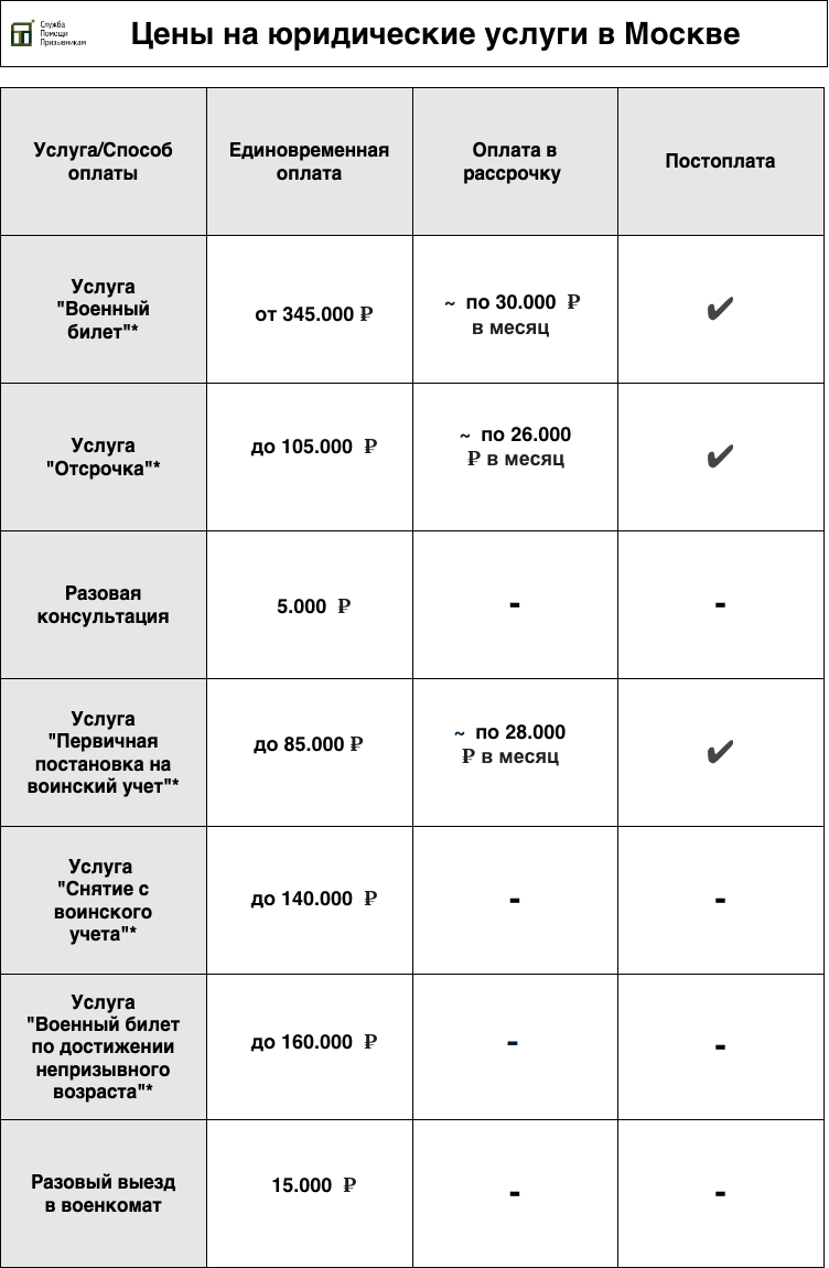 Прочерки в прейскуранте обозначают, что такой способ оплаты в данном виде услуг не предполагается. Например, мы не оказываем услуги в рассрочку или методом постоплаты для тех молодых людей, которые обращаются к нам за разовым выездом в военкомат.